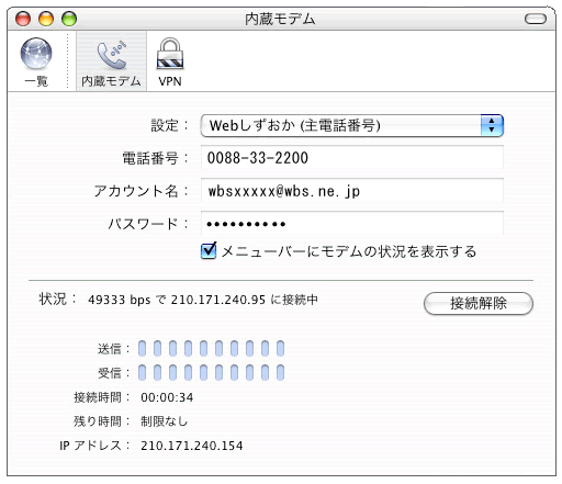 | 2、[内蔵モデム]という画面が表示されます。「接続」ボタンを押すと接続が開始されます。 | ||